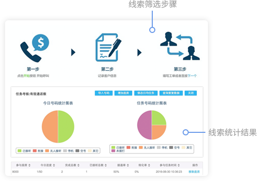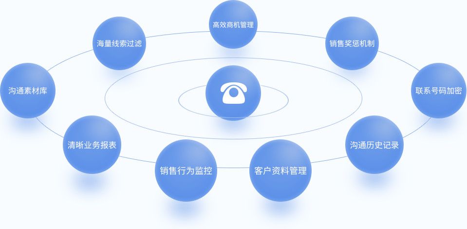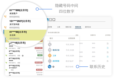 号码加密,让销售在不知道客户联系方式的情况下与客户联络。联系历史 记录所有联系内容,无缝衔接新老销售更替。